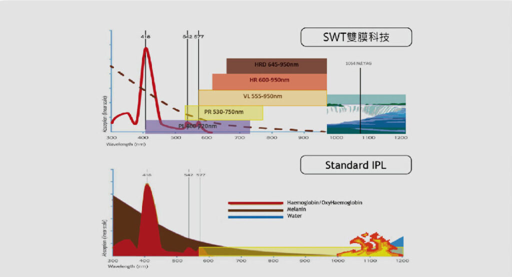 2. 創新「類染料式脈衝」,結合兩大專利科技「雙模科技」及「直角方型脈衝」,二段式過濾無效波段與能量,精準直達問題根源。醫師依照專業選擇不同的波長及能量範圍,藉由不同病灶吸收不同的波長,可達到治療或改善肌膚的效果。應用領域包括色素斑、血管病變、膚質改善、除毛等,是安全且有效的治療方式。