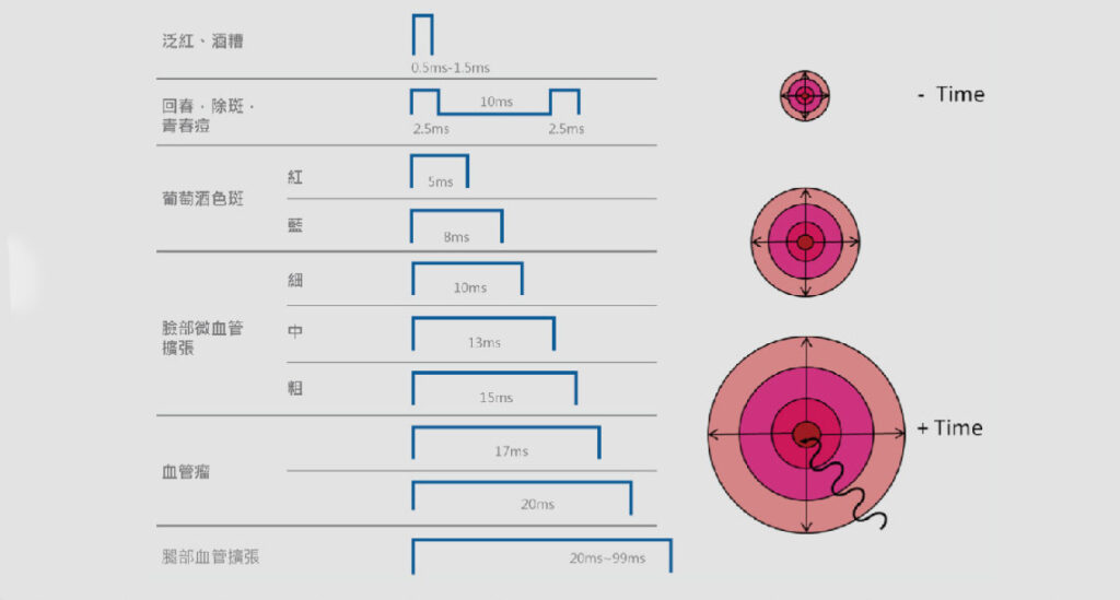 .長脈衝Nd:YGA雷射(2.5-90ms):可治療血管病變,例如靜脈曲張、腹部微血管擴張或其他直徑較粗的血管擴張問題的。